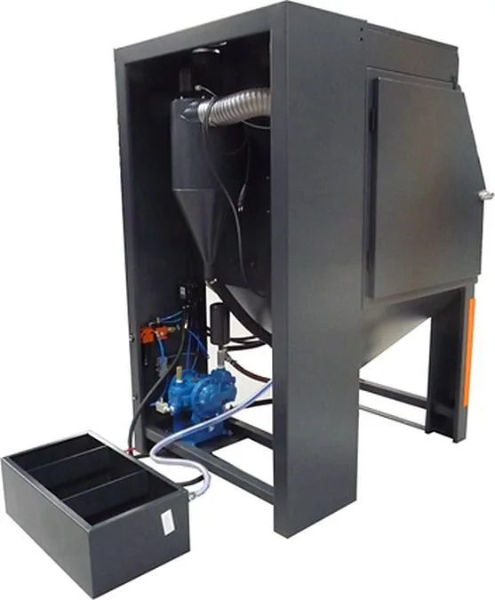 Kabina je zhotovena z nerezové oceli a upravena pro mokré procesy. Poskytuje pracovní prostor 1100 x 940 x 820 mm. Je vybavena speciálním čerpadlem, které zajišťuje konstantní dodávku směsi tryskacího média a vody do trysky. Z ní je směs vytlačována stlačeným vzduchem vysokou rychlostí proti tryskanému povrchu.